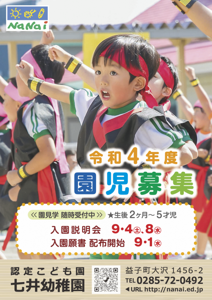 本日より、下記の通り、令和4年4月に入園する園児を募集します。